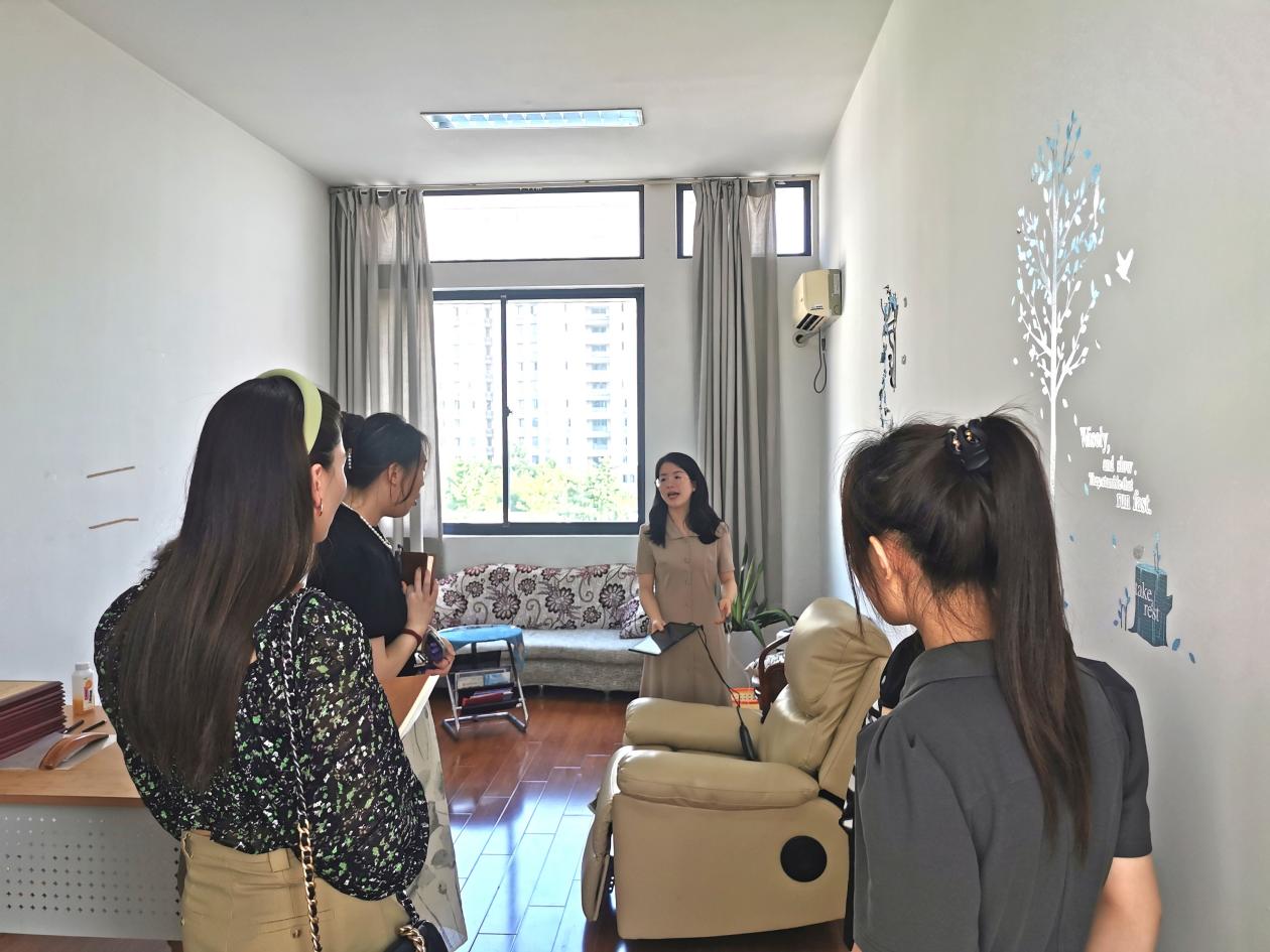 心理健康中心教师包金金带领师生参观了接待室、个体咨询室、团体辅导室及沙盘游戏室等工作场所,介绍了中心的内部布局、功能分区、心理设备、服务范围等情况,并体验了“情绪放松按摩椅”“智能交互呐喊宣泄仪”“音乐放松反馈系统”等心理专用设备,通过参观,员工们对公司心理健康教育中心工作环境和工作机制有了初步了解。“没想到心理中心这么好玩!在按摩椅上躺了一会,一天的疲惫都消散而空了,下次累了来躺躺,心理不开心了来找老师们聊一聊,我很喜欢这里的氛围。”2023级新生张婷开心地说。