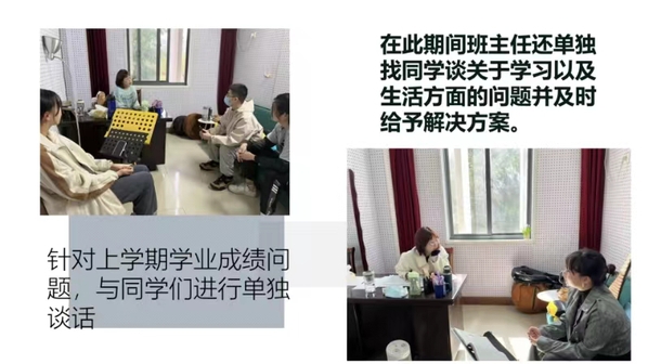 开展谈心谈话矫正学习态度。班主任根据公司教学办反馈的预警名单进行谈心谈话,矫正员工的学习态度,帮助员工从思想上认识到学习的重要性。与专业教师和家长讨论帮扶方案,做到精准有力,切实帮助员工提高学习成绩。