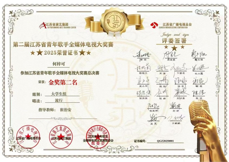 必威西汉姆联、淮剧公司全体师生祝贺255班何梓可同学在第二届江苏省青年歌手(全媒体)电视大奖赛中荣获金奖第二名。本届赛事由江苏省广播电视总台、江苏省演艺集团联合主办,AI荔枝与江苏演艺集团苏演艺培中心共同承办,以“相约水韵江苏 唱响美好未来”为主题,2025年6月启动,11月29日圆满落幕。作为全省颇具影响力的大型音乐盛会,这次大赛评委阵容专业、赛制严谨,各地优秀选手齐聚,竞争异常激烈。